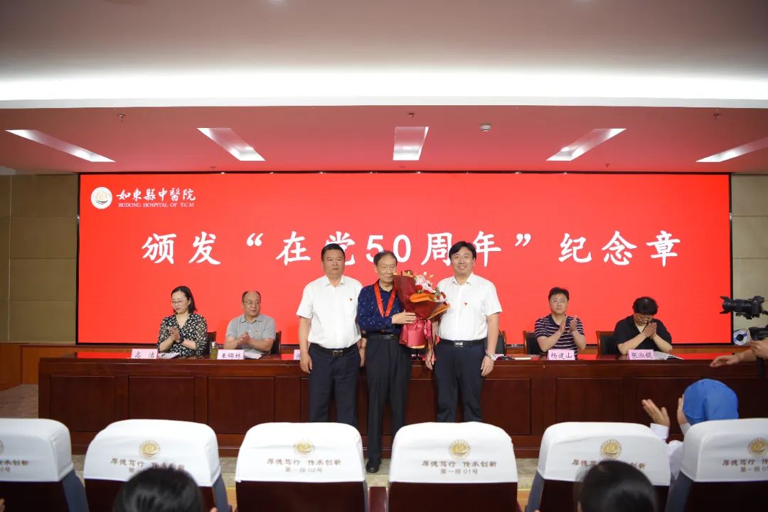 光荣在党五十载,初心不渝获真章。党委书记顾海军、党委副书记、院长沈巍为离退休党支部委员、钱氏伤科传承人、我院骨伤科技术顾问钱忠权颁发纪念章、送上鲜花。老党员精神抖擞,胸前的纪念章熠熠生辉。台下与会人员掌声不断,致敬老党员对初心使命的坚守,礼赞伟大的中共产党102周年生日。